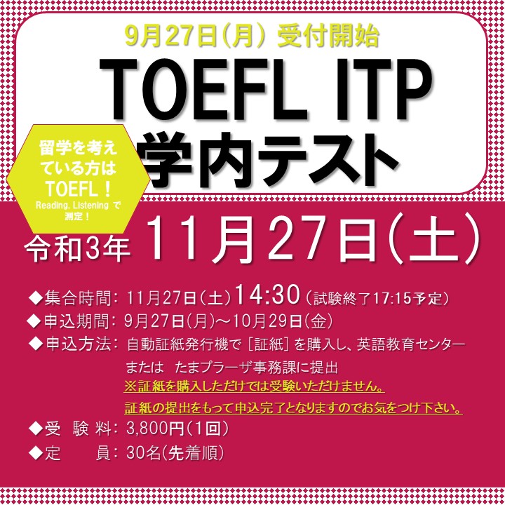 英語教育センターでは、令和3年11月27日(土)に TOEFL ITP学内テストを実施いたします。