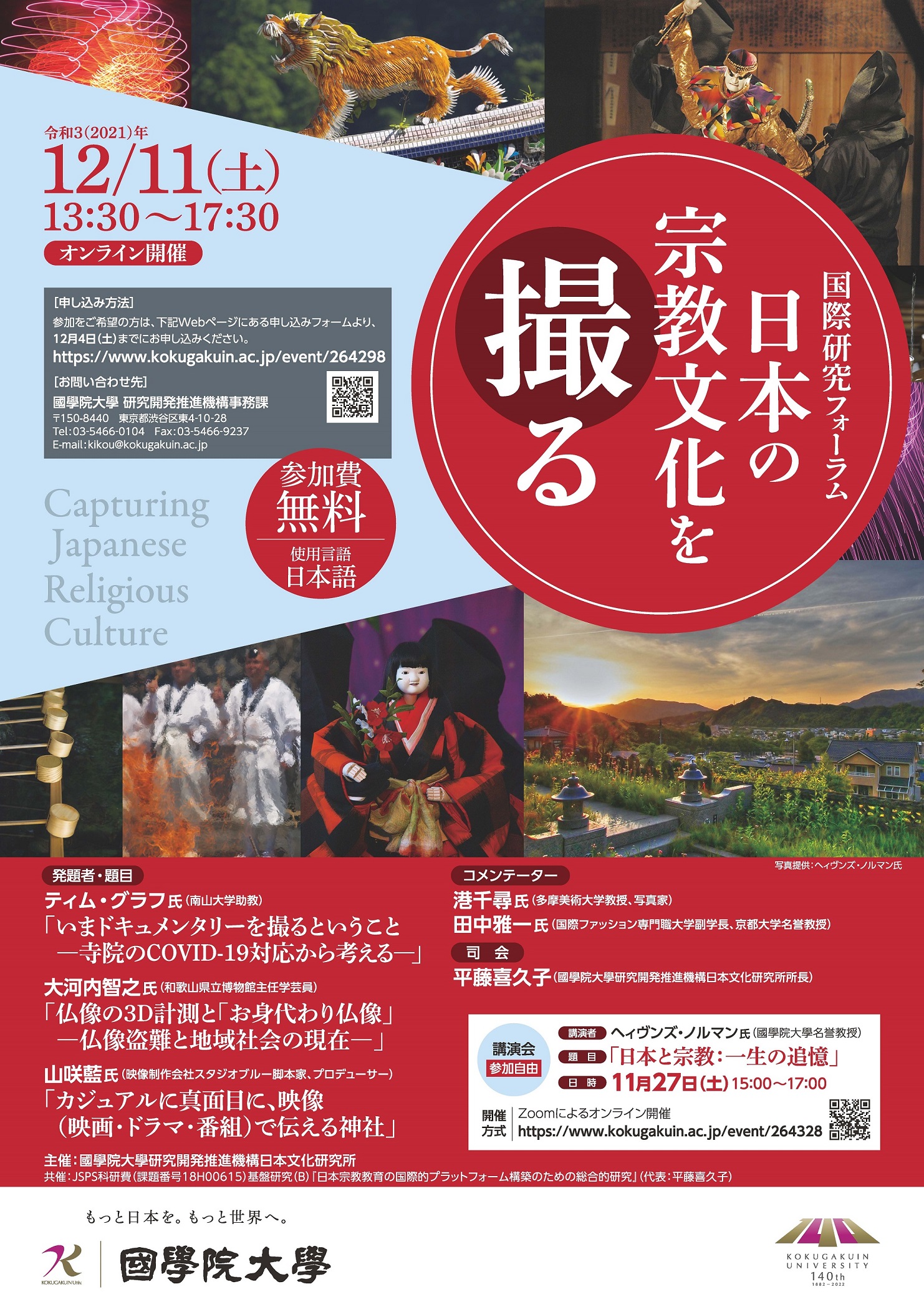 このような時代だからこそ、今回は「日本の宗教文化を撮る」ことをテーマとし、その難しさ、面白さ、危うさ、楽しさを議論することにしたい。