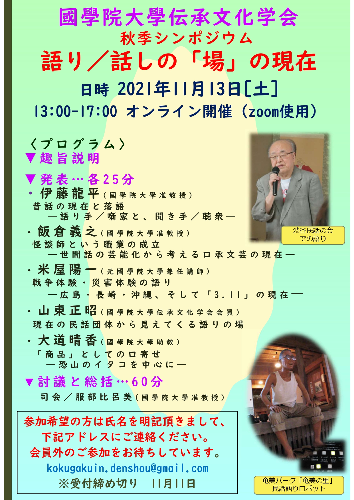 【発表】各25分 伊藤 龍平 (國學院大學准教授) 昔話の現在と落語 ―語り手/噺家と、聞き手/聴衆― 飯倉 義之 (國學院大學准教授) 怪談師という職業の成立 ―世間話の芸能化から考える口承文芸の現在― 米屋 陽一 (元國學院大學兼任講師) 戦争体験・災害体験の語り -広島・長崎・沖縄、そして「3.11」の現在― 山東 正昭 (國學院大學伝承文化学会会員) 現在の民話団体から見えてくる語りの場 大道 晴香(國學院大學助教) 「商品」としての口寄せ -恐山のイタコを中心に― 【討議と総括】60分 司会進行 服部 比呂美(國學院大學准教授) 参加希望の方は、氏名を明記頂きまして下記アドレスにご連絡ください。会員外のご参加をお待ちしています。 kokugakuin.denshou@gmail.comから11月11日(木)までにお申し込みください。 |