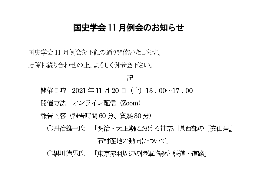 国史学会11月例会を以下の通り開催いたします。