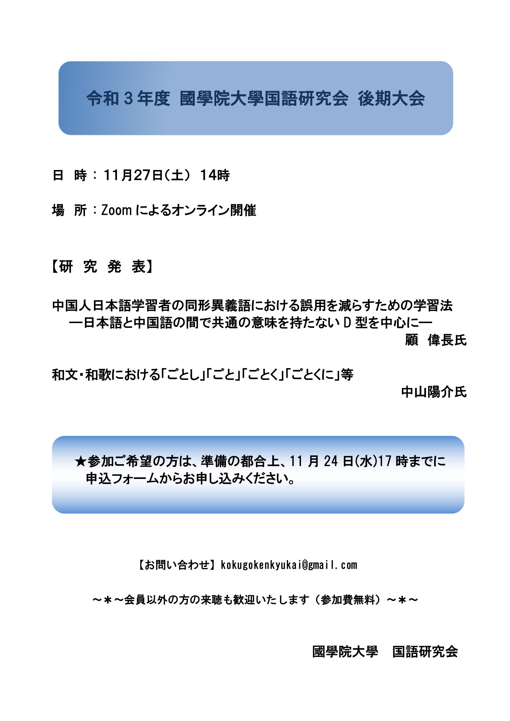 ★参加ご希望の方は、準備の都合上、11月24日(水)17時までに 【お問い合わせ】kokugokenkyukai@gmail.com |
