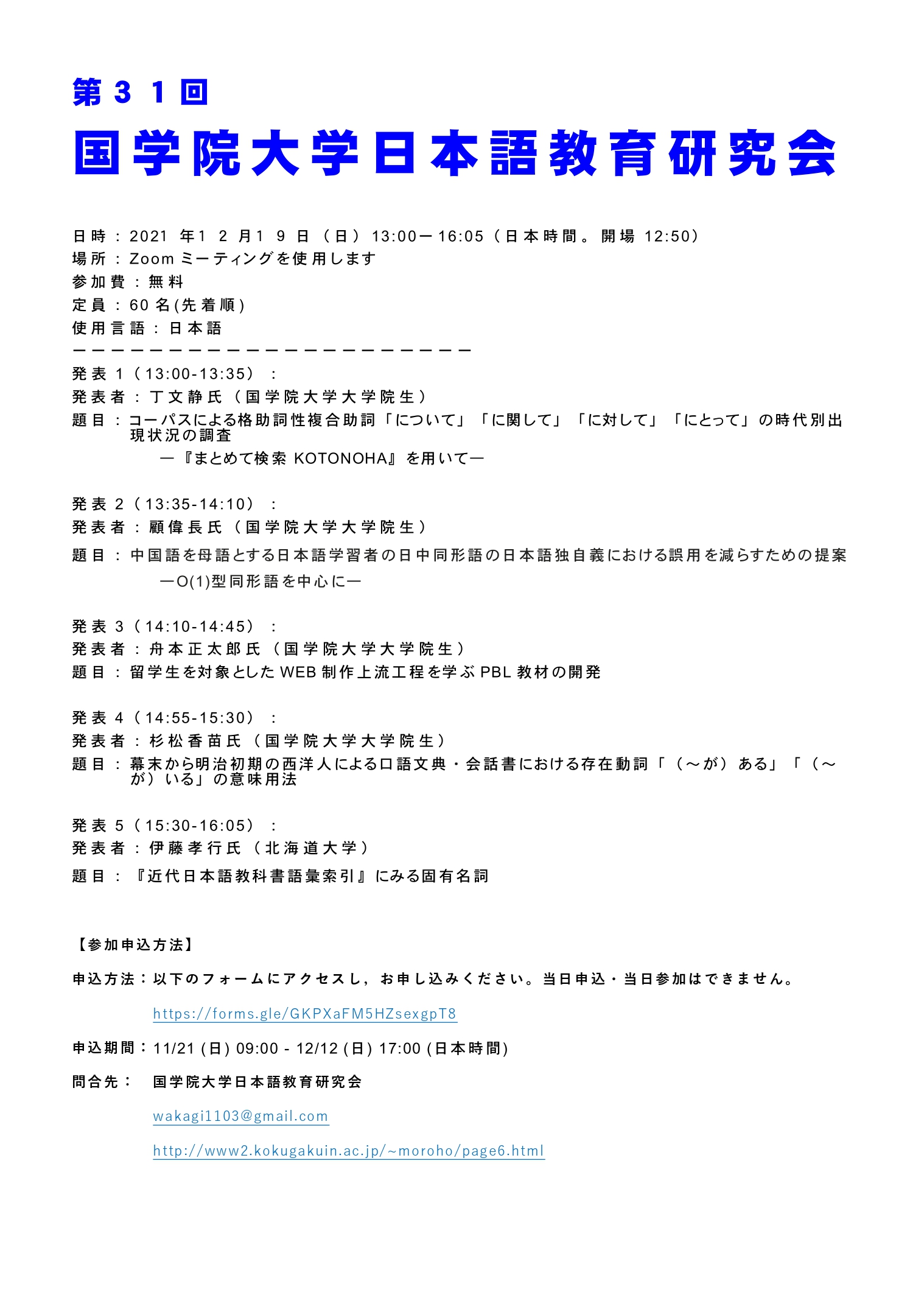 申込方法:以下のフォームにアクセスし,お申し込みください。当日申込・当日参加はできません。 申し込みフォーム 国学院大学日本語教育研究会 |