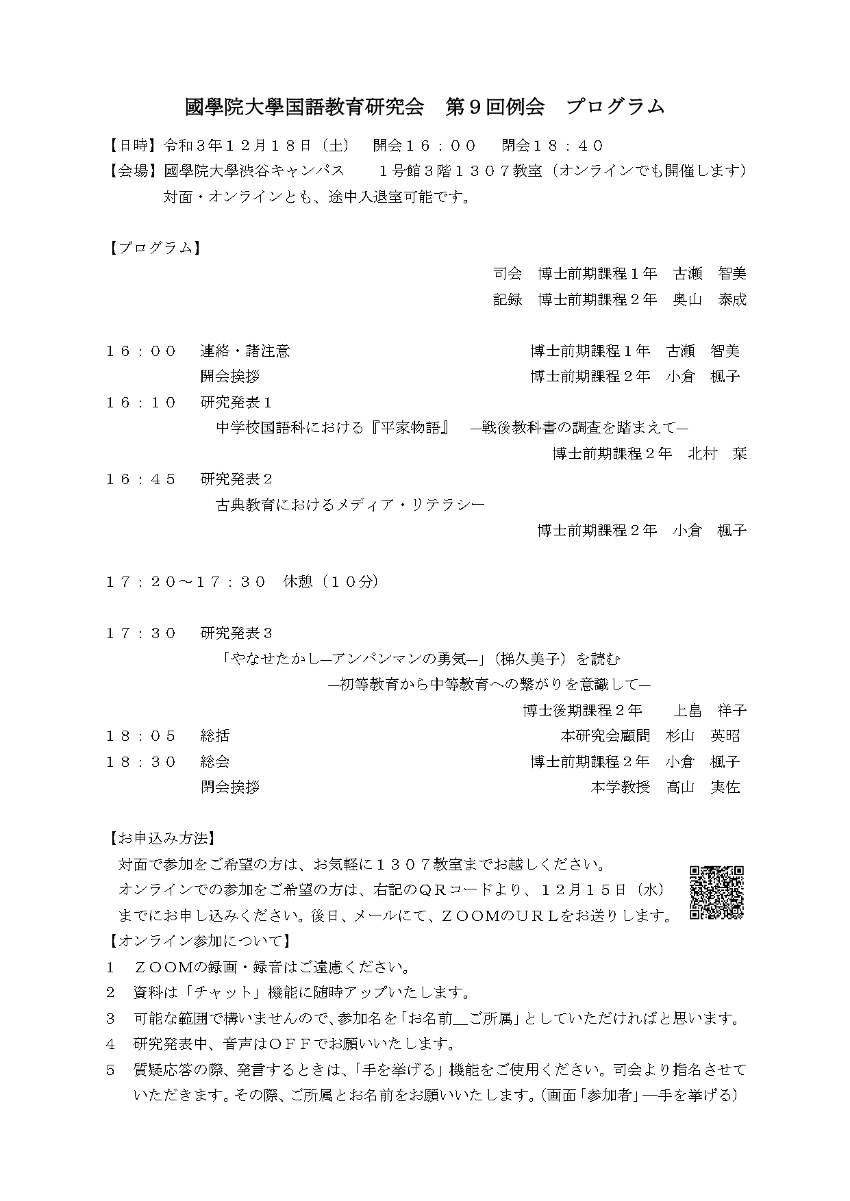 申込方法:以下のフォームにアクセスし、お申し込みください。 お申し込み締め切り日:12月15日(水) 國學院大學国語教育研究会 |