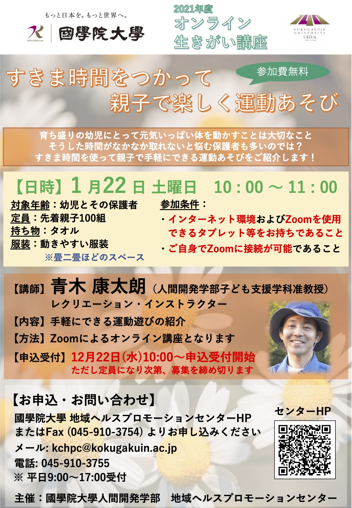 ①お申込はこちらから! ※100組先着順(要申込) オンライン生きがい講座 「すきま時間をつかって親子で楽しく運動あそび〜」 ※申込が完了すると、自動返信システムにより確認メールが届きます.メールが届かない場合は「迷惑メール」もご確認ください. また,迷惑メールの対策などでドメイン指定を行っている場合、メールが受信できない場合がございます. ※講座の約3日前に、担当者から再度確認メールをお送り致します(その際にURLをお送りいたします).