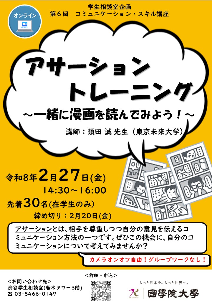 学生相談室主催、臨床心理士による、【アサーション・トレーニング ~ 一緒に漫画を読んでみよう! ~ 】講座を開催します!
