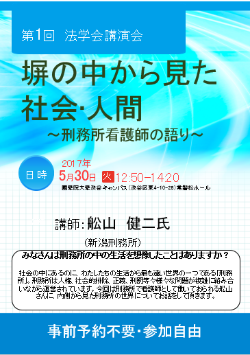 5月30日12時50分~14時20分(3限)に渋谷キャンパス常磐松ホールにおいて、平成29年度第1回法学会講演会を開催します。新潟刑務所より舩山健二さんをおよびして、内側から見た刑務所の世界についてお話していただきます。貴重な機会ですので、是非ご参加ください。