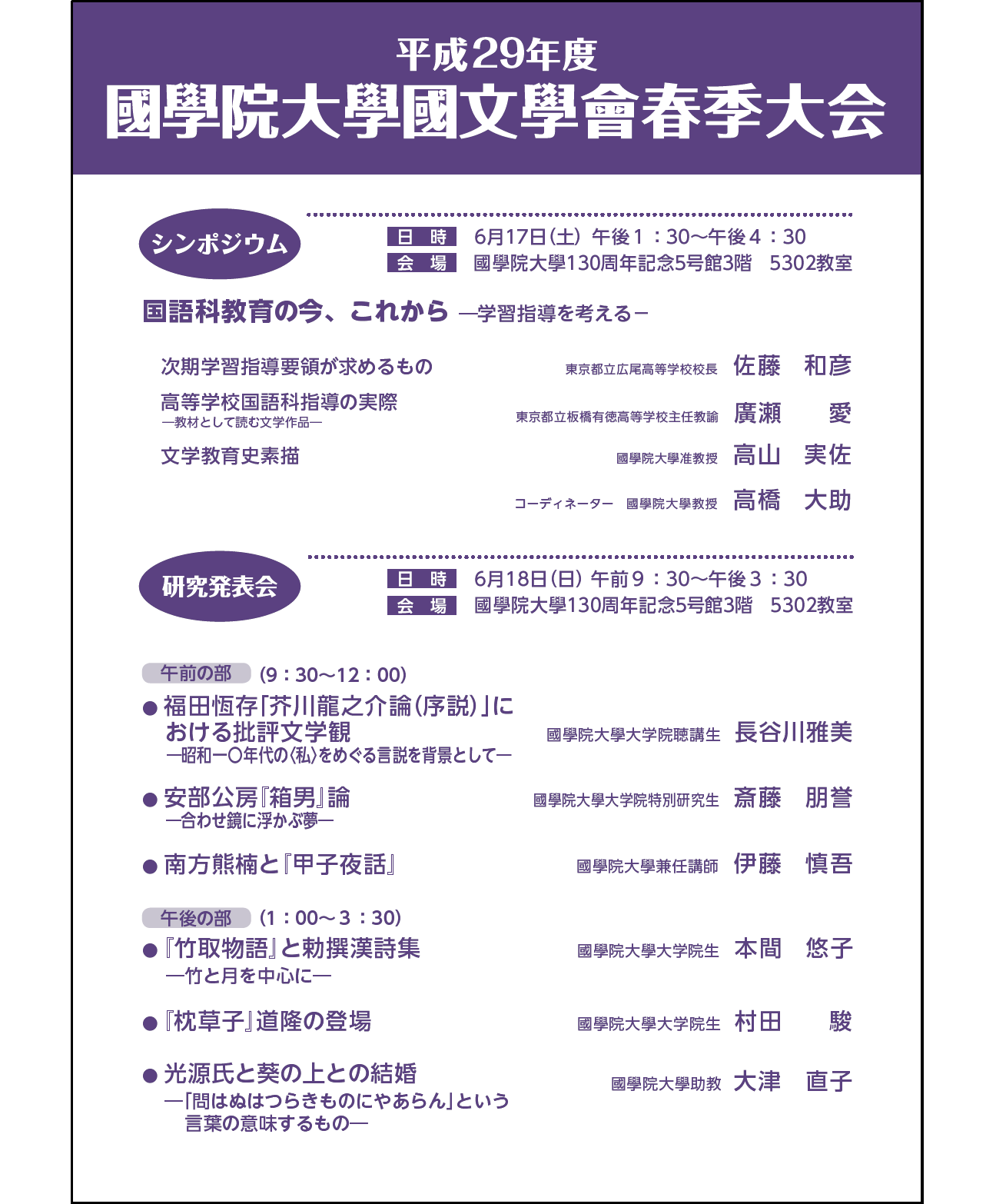 下記の通り、平成29年度國學院大學國文學會春季大会を開催いたします。