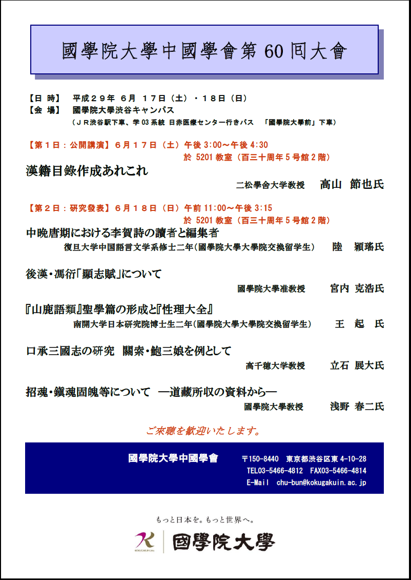 下記の通り、平成29年度國學院大學中國學會第60囘大會を開催いたします。