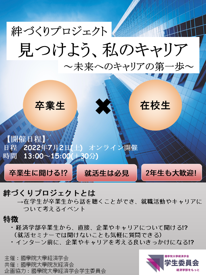 経済学部では、令和4年7月2日(土)に、卒業生と在学生を結びつける企画「絆づくり」プロジェクトを実施します。
