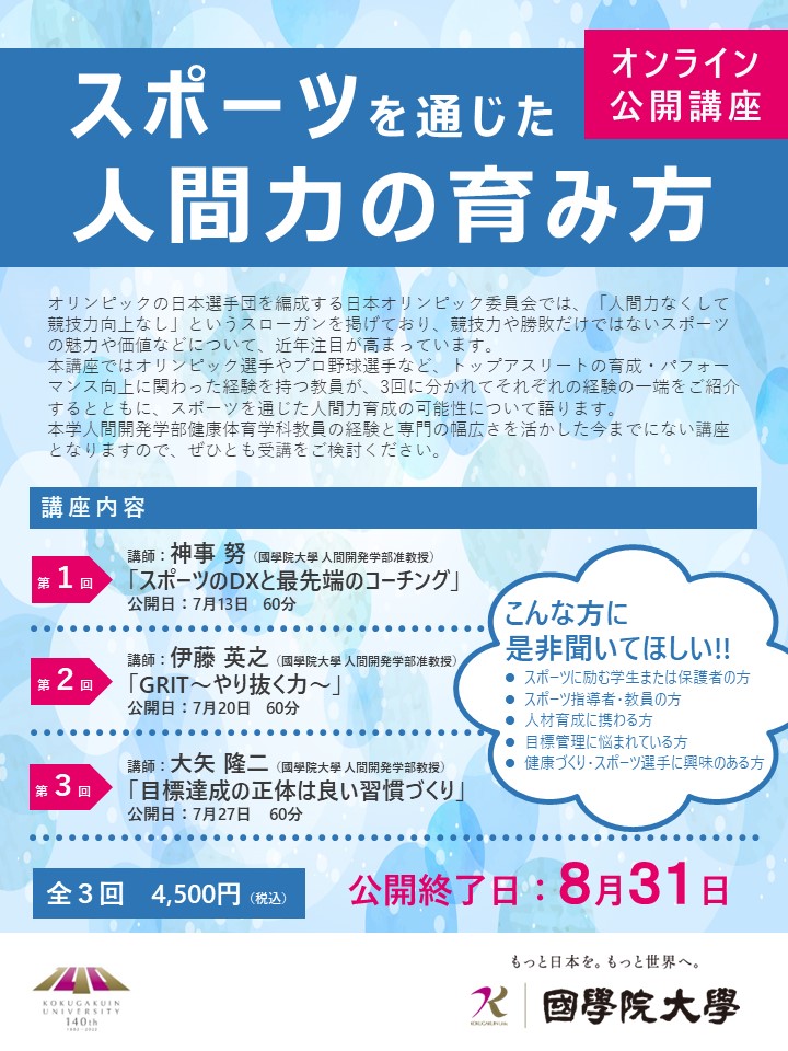 本講座ではオリンピック選手やプロ野球選手など、トップアスリートの育成・パフォーマンス向上に関わった経験を持つ教員が、3回に分かれてそれぞれの経験の一端をご紹介するとともに、スポーツを通じた人間力育成の可能性について語ります。