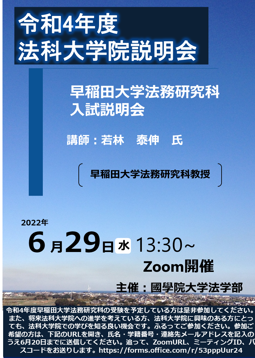 この度、早稲田大学法務研究科教授の若林泰伸先生をお招きし、早稲田大学法務研究科入試説明会を開催します。令和4年度早稲田大学法務研究科の受験を予定している方は是非ご参加ください。また、将来法科大学院への進学を考えている方、法科大学院に興味のある方にとっても、法科大学院での学びを知る良い機会です。ふるってご参加ください。