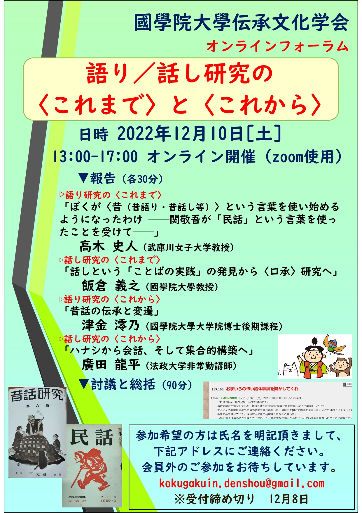 下記の通り、國學院大學伝承文化学会秋季オンラインフォーラム「語り/話し研究の〈これまで〉と〈これから〉」を開催いたします。