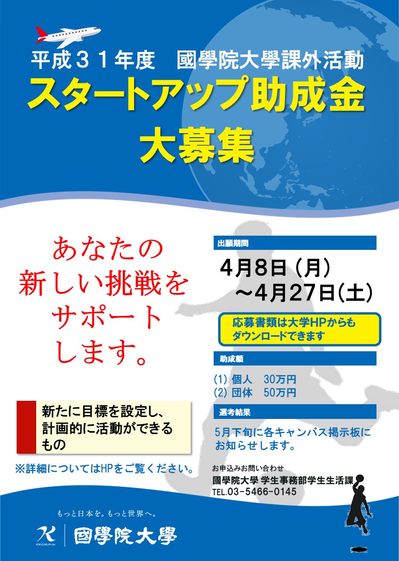 「國學院大學課外活動スタートアップ助成金」は、課外活動を通じて学生みなさんが成長することを期待して設立した制度です。