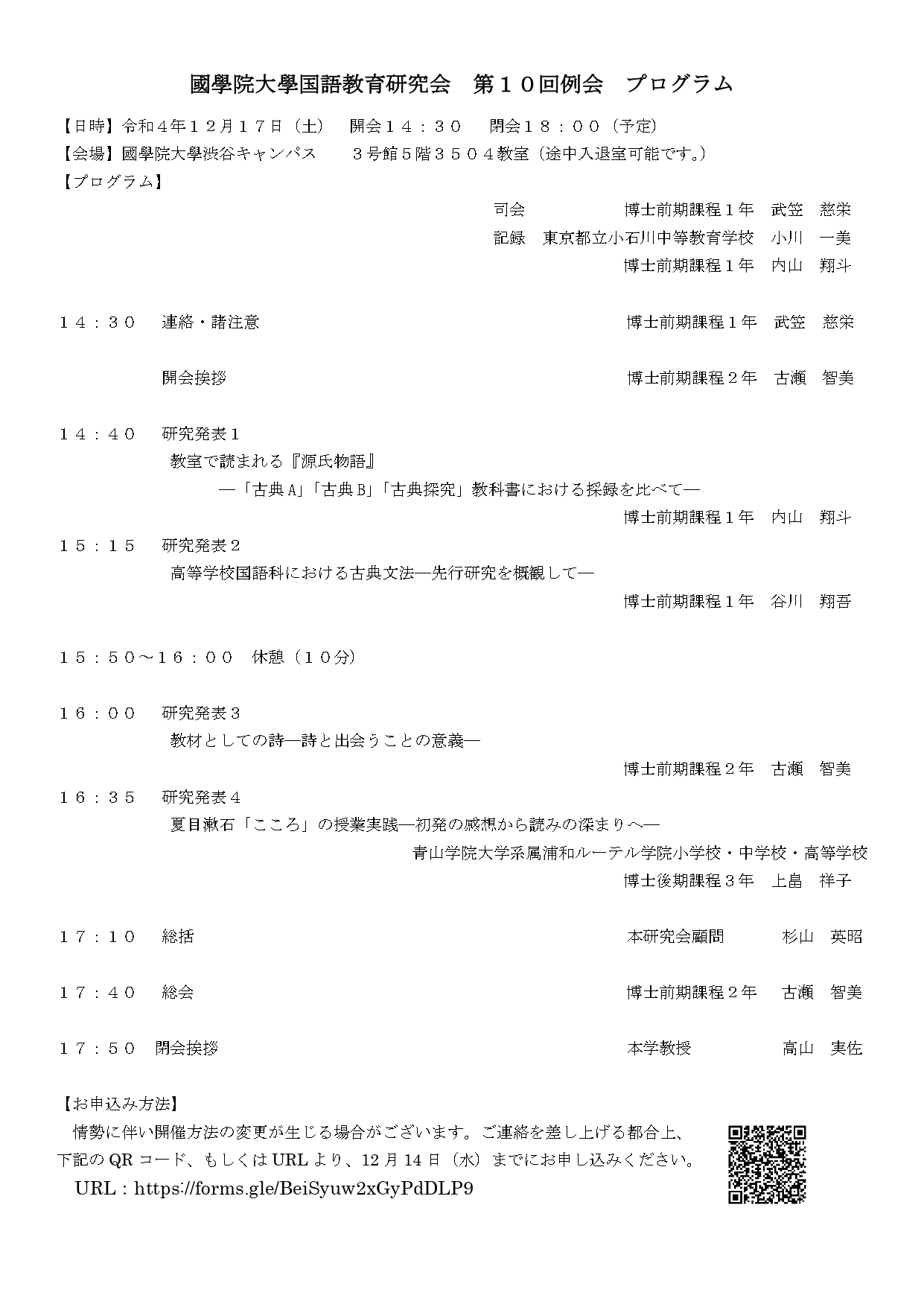 情勢に伴い開催方法の変更が生じる場合がございます。 お申し込み締め切り日:12月14日(水) 國學院大學国語教育研究会 |