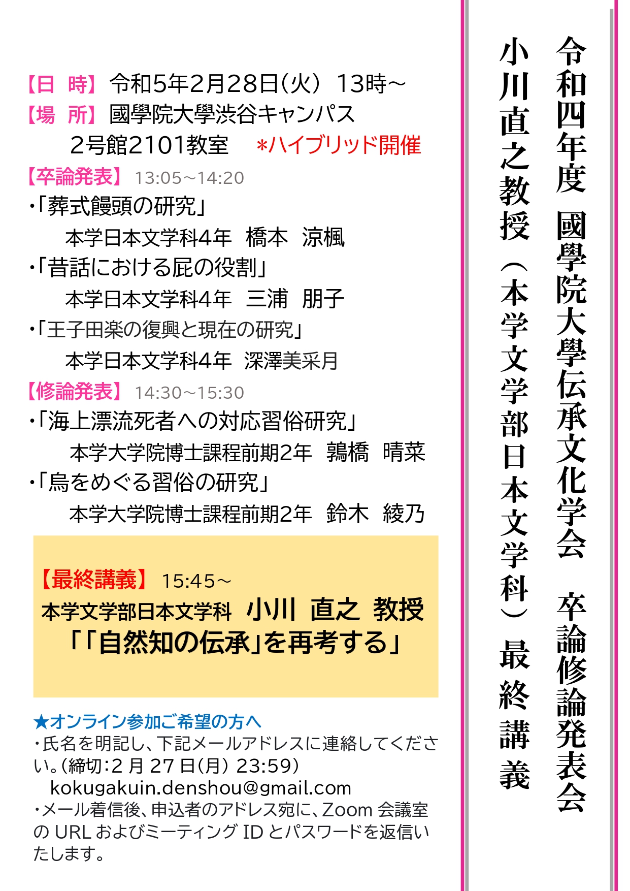 また、本学文学部日本文学科 小川直之教授最終講義が以下の通り行われますのでご案内いたします。