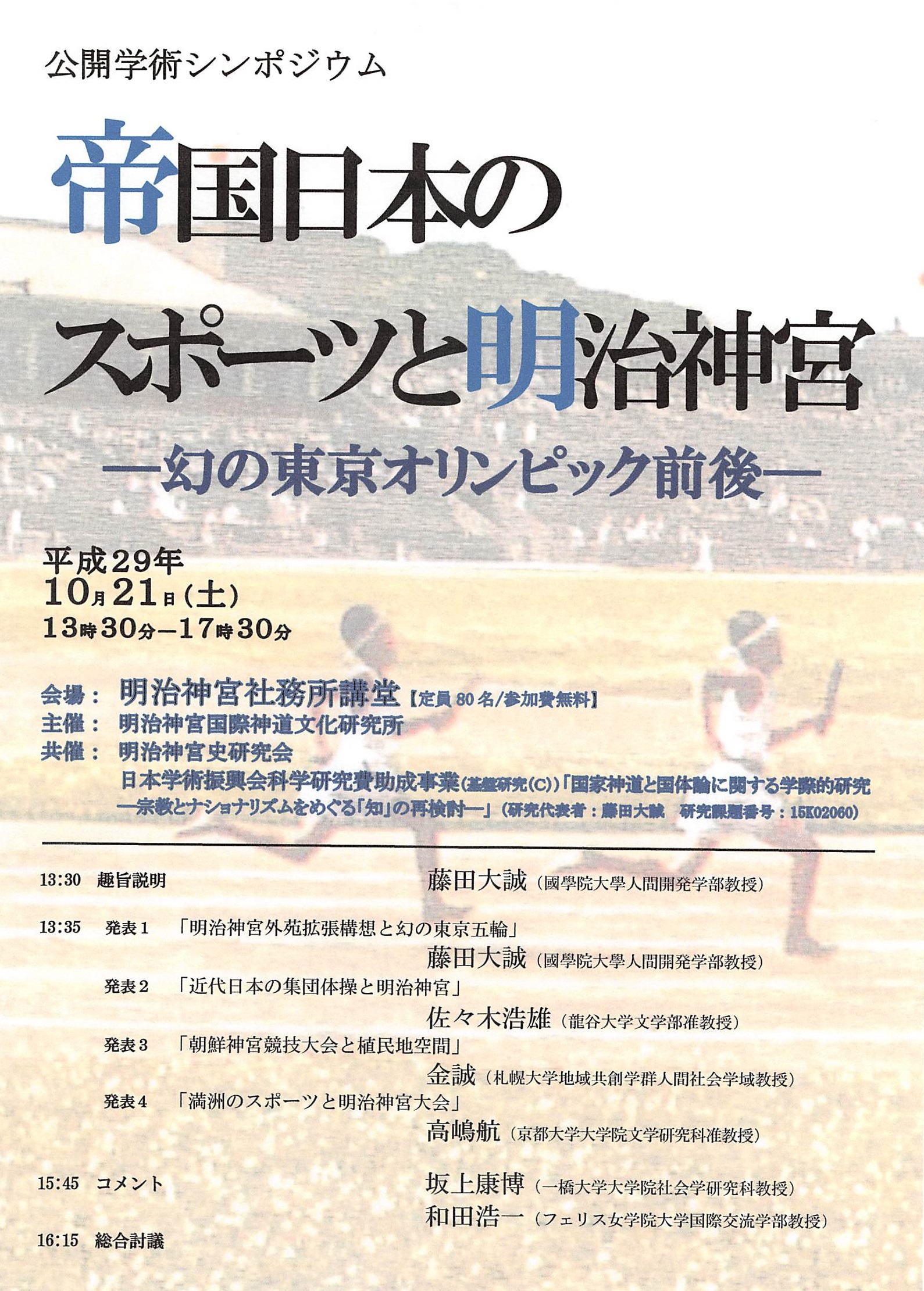 そこで本シンポジウムでは、「幻の東京オリンピック」前後の大正後期から昭和戦前期に焦点を当てて、明治神宮外苑の体育・スポーツ空間と明治神宮大会の展開を軸としつつ、東アジア全体を視野に入れた〈帝国日本〉の体育・スポーツについて議論を行いたい。