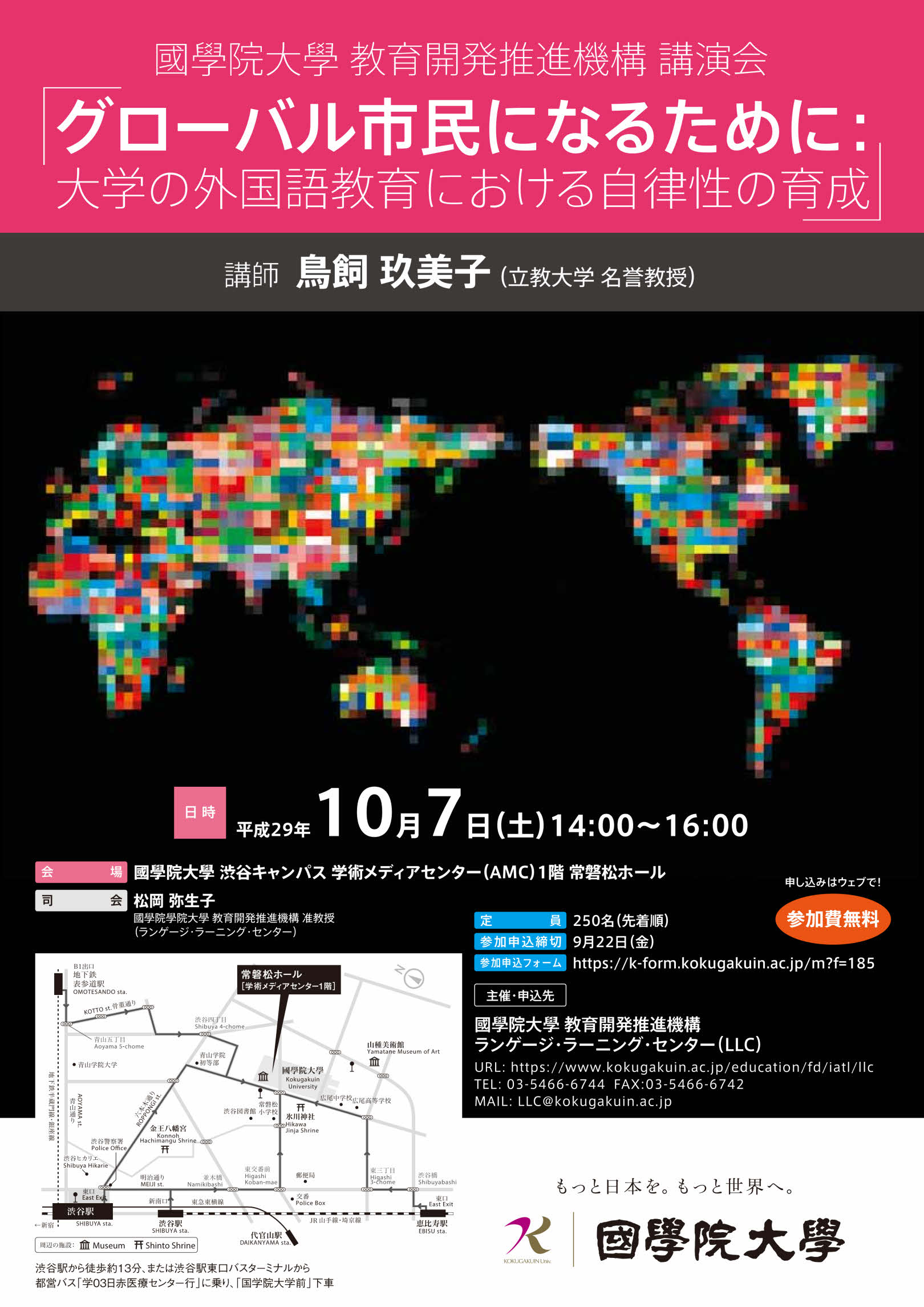 國學院大學教育開発推進機構ランゲージ・ラーニング・センター(LLC)では、このたび、「グローバル市民になるために:大学の外国語教育における自律性の育成」というテーマで、英語教育の専門家である鳥飼玖美子氏をお招きして公開講演会を開催いたします。