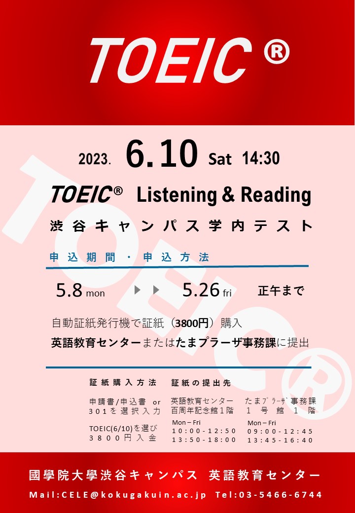 英語教育センターでは、令和5年6月10日(土)に第2回 TOEIC(R) L&R学内テスト(TOEIC IP)を実施いたします。