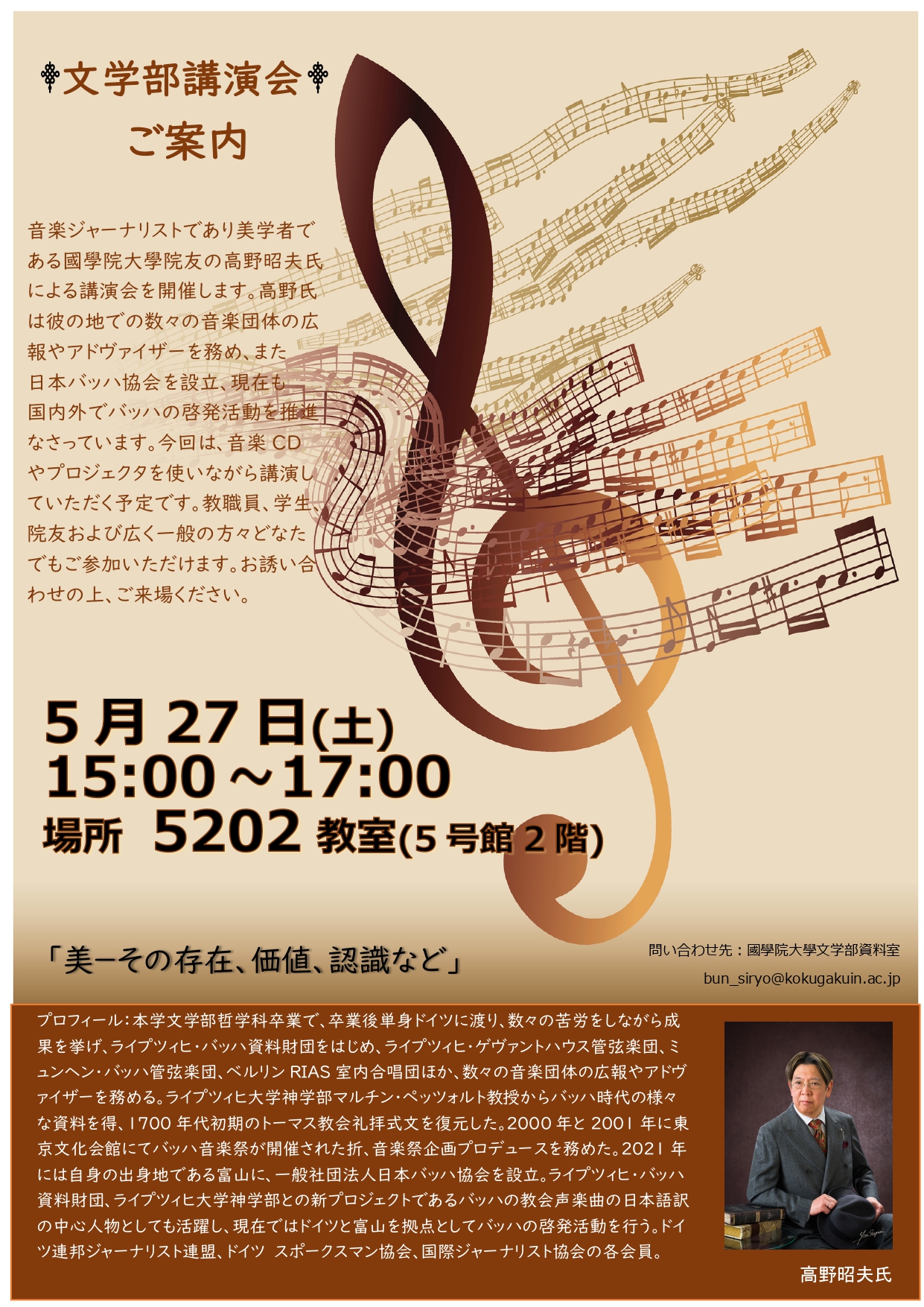 音楽ジャーナリストであり美学者である國學院大學院友の高野昭夫氏による講演会を開催します。