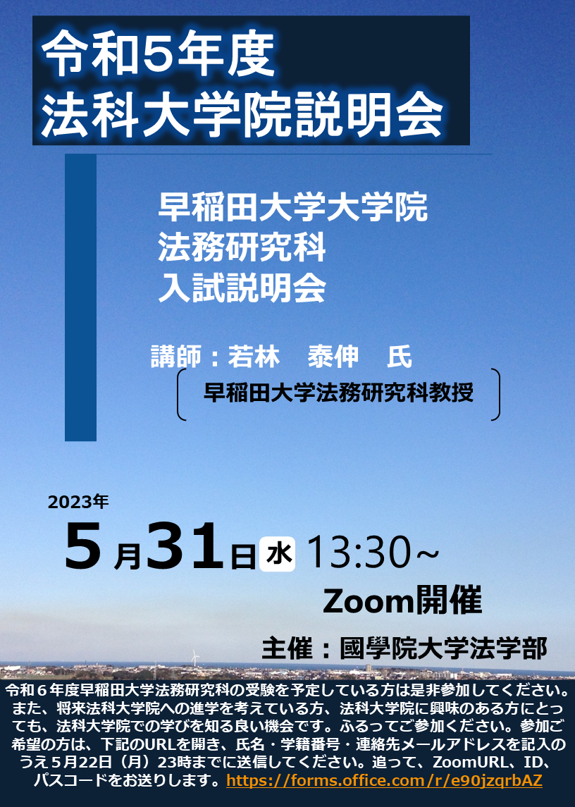 この度、早稲田大学法務研究科教授の若林泰伸先生をお招きし、早稲田大学法務研究科入試説明会を開催します。令和6年度早稲田大学法務研究科の受験を予定している方は是非ご参加ください。また、将来法科大学院への進学を考えている方、法科大学院に興味のある方にとっても、法科大学院での学びを知る良い機会です。ふるってご参加ください。