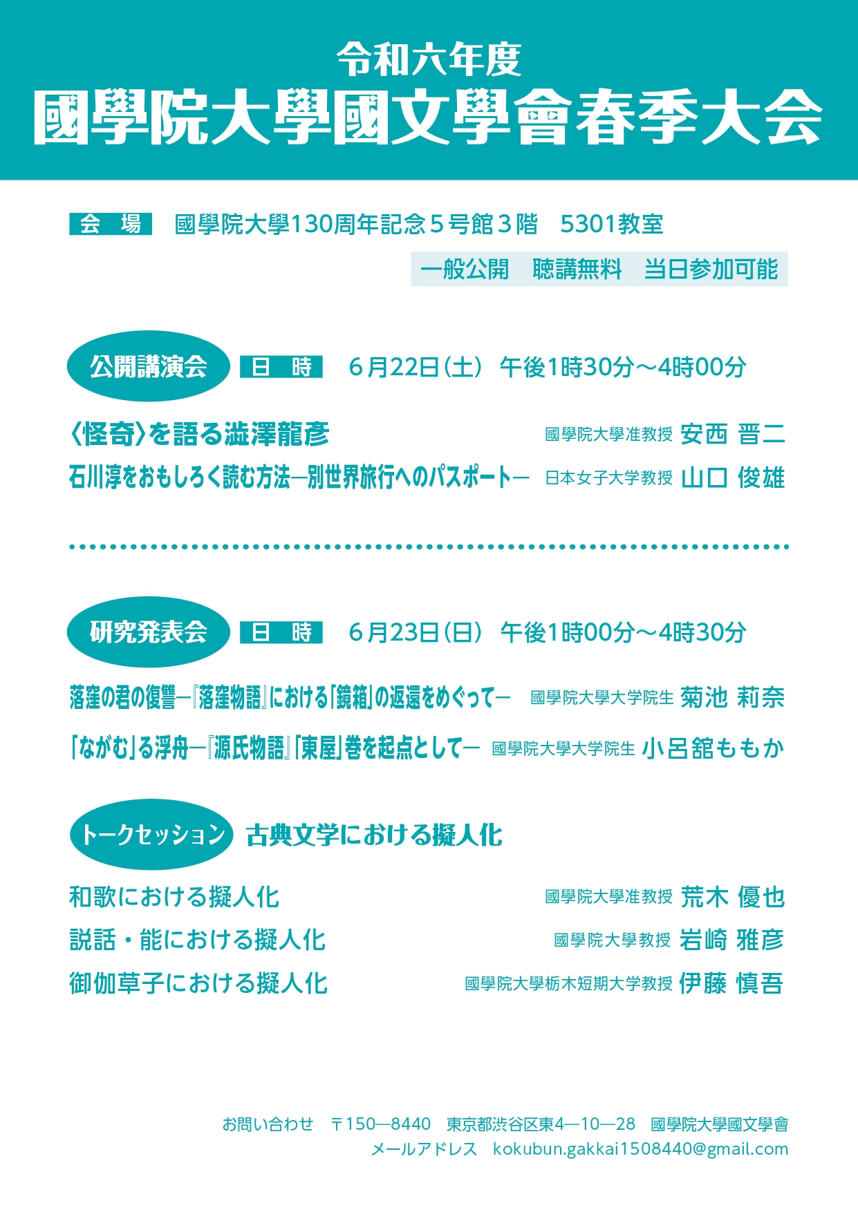 下記の通り、令和6年度國學院大學國文學會春季大会を開催いたします。