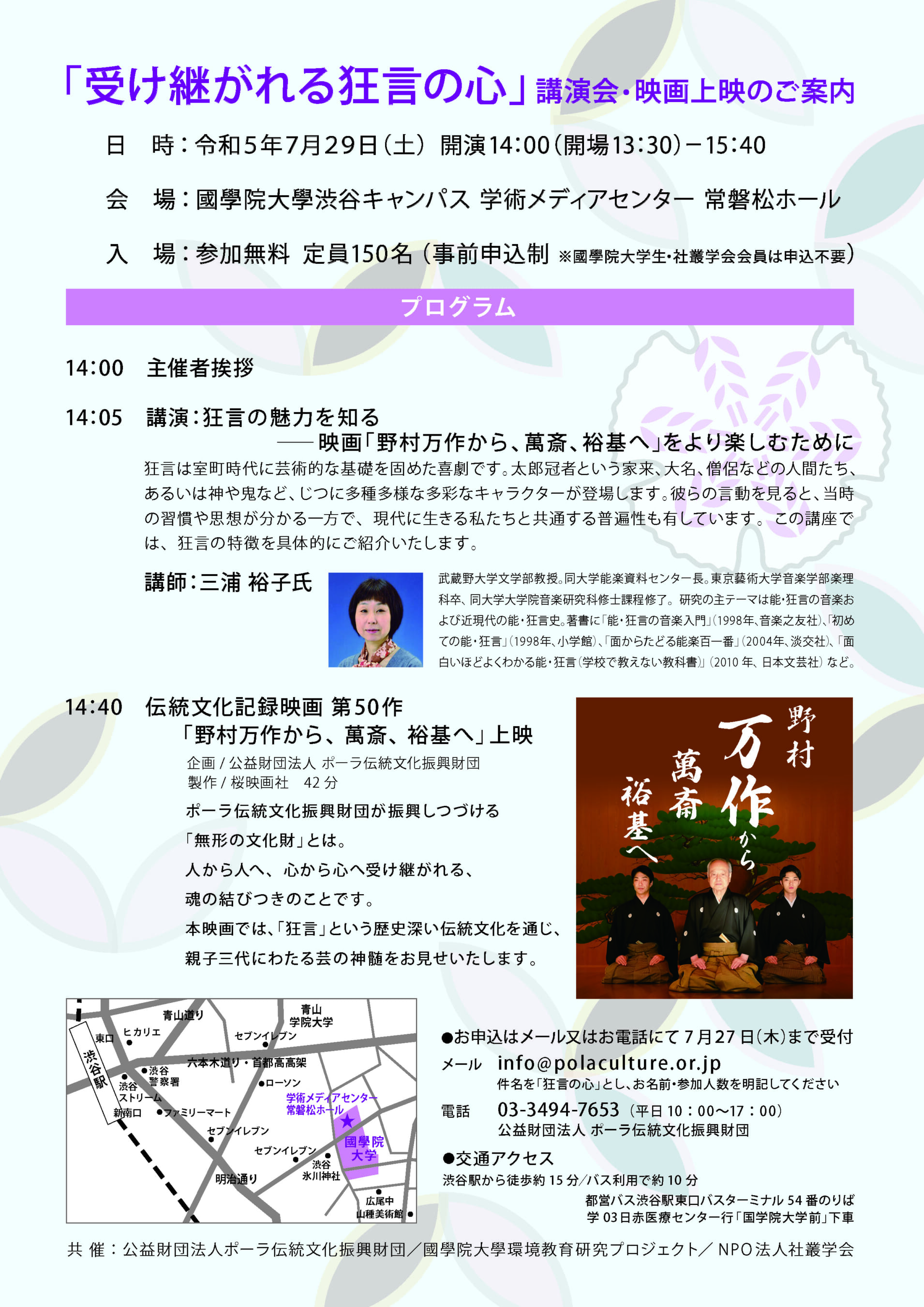 info@polaculture.or.jp ※件名を「狂言の心」とし、お名前・参加人数を明記してください。 |
