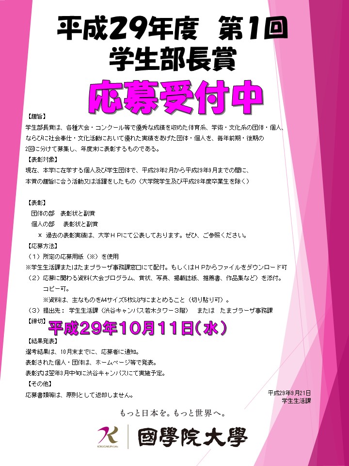 学生部では平成29年度第1回の「学生部長賞」を募集いたします。