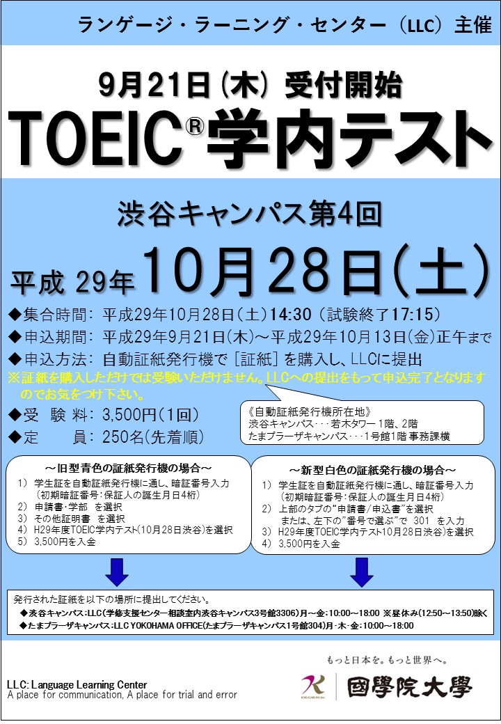 ランゲージ・ラーニング・センター(LLC)では、平成29年10月28日に第4回 TOEIC学内テスト(TOEIC IP)を実施いたします。