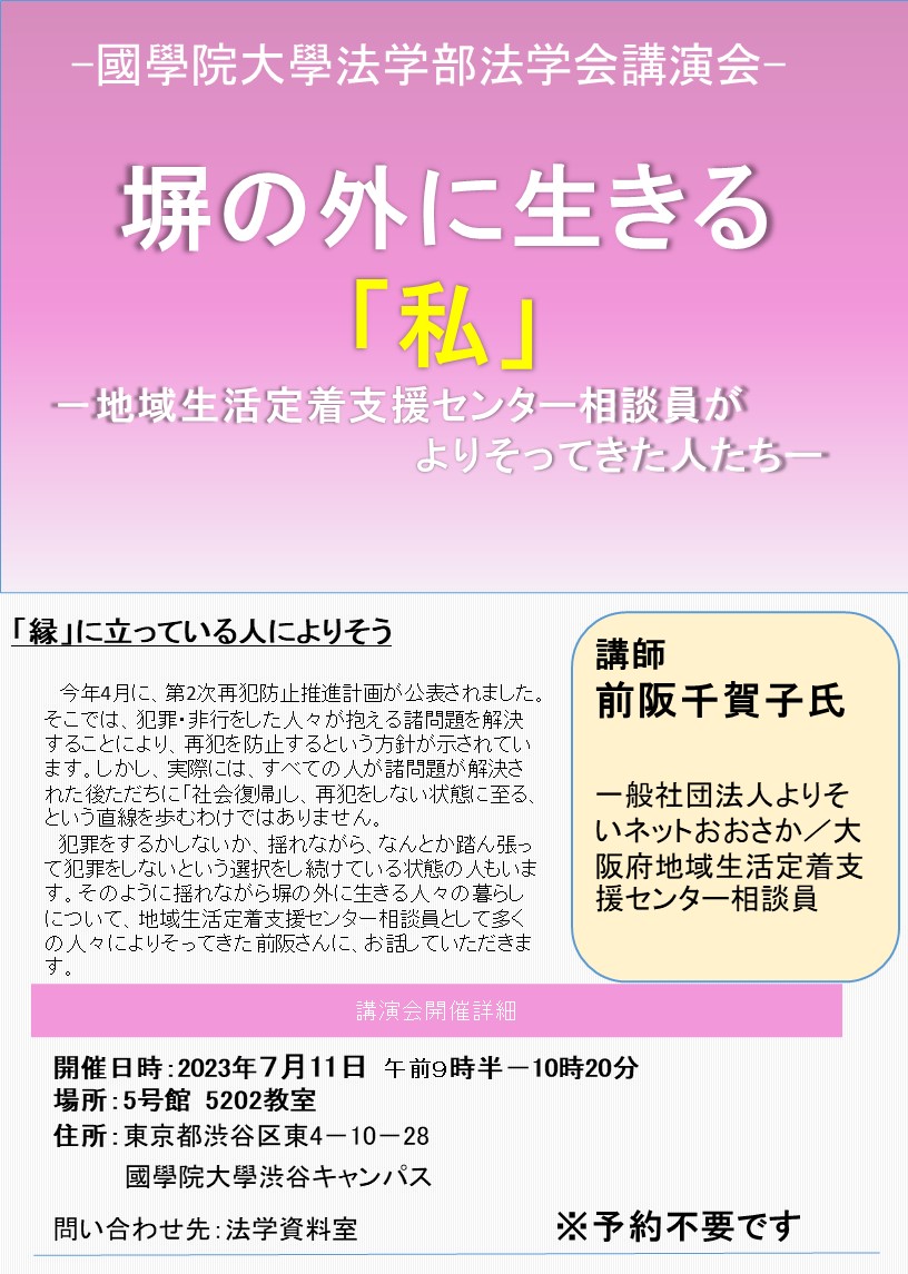 令和5年度第1回法学会講演会「塀の外に生きる「私」-地域生活定着支援センター相談員がよりそってきた人たちー」を開催します。