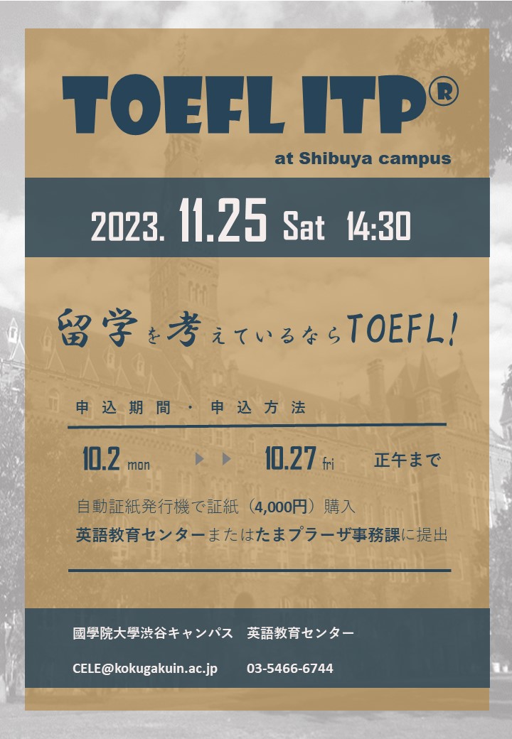 英語教育センターでは、令和5年11月25日(土)に TOEFL ITP学内テストを実施いたします。