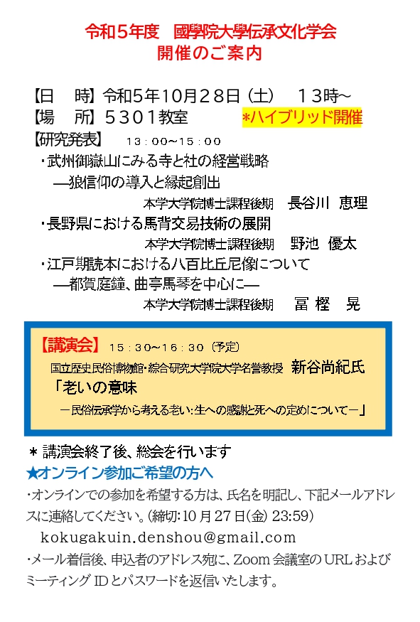 下記の通り、令和5年度 國學院大學伝承文化学会を開催いたします。