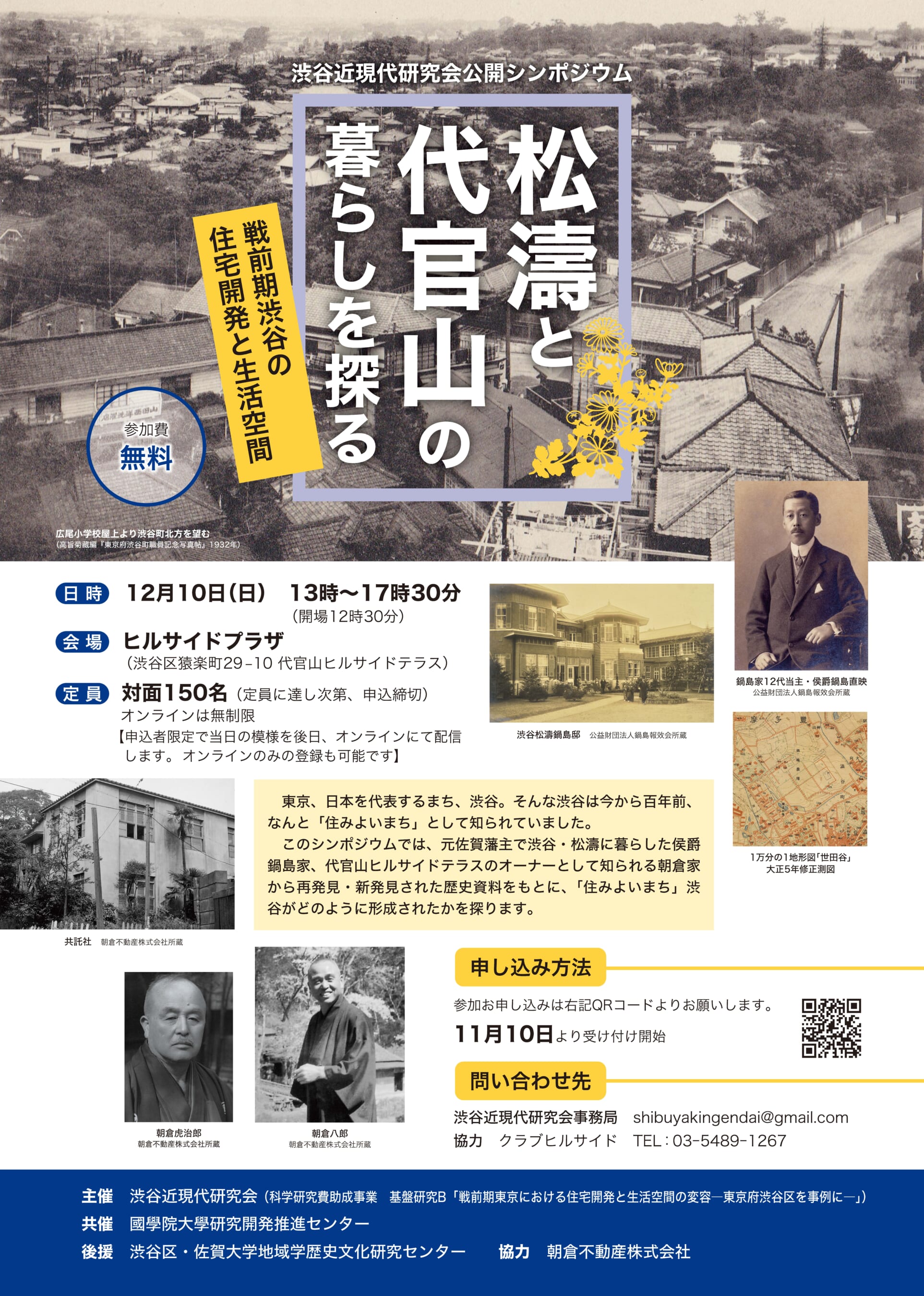 このシンポジウムでは、元佐賀藩主で渋谷に暮らし、その名を「鍋島松濤公園」に残す侯爵鍋島家、代官山ヒルサイドテラスのオーナー家として知られる朝倉家から再発見・新発見された歴史史料を活用しながら、松濤地域と代官山地域を中心に、「住みよいまち」渋谷がどのように形成されたかを探ります。