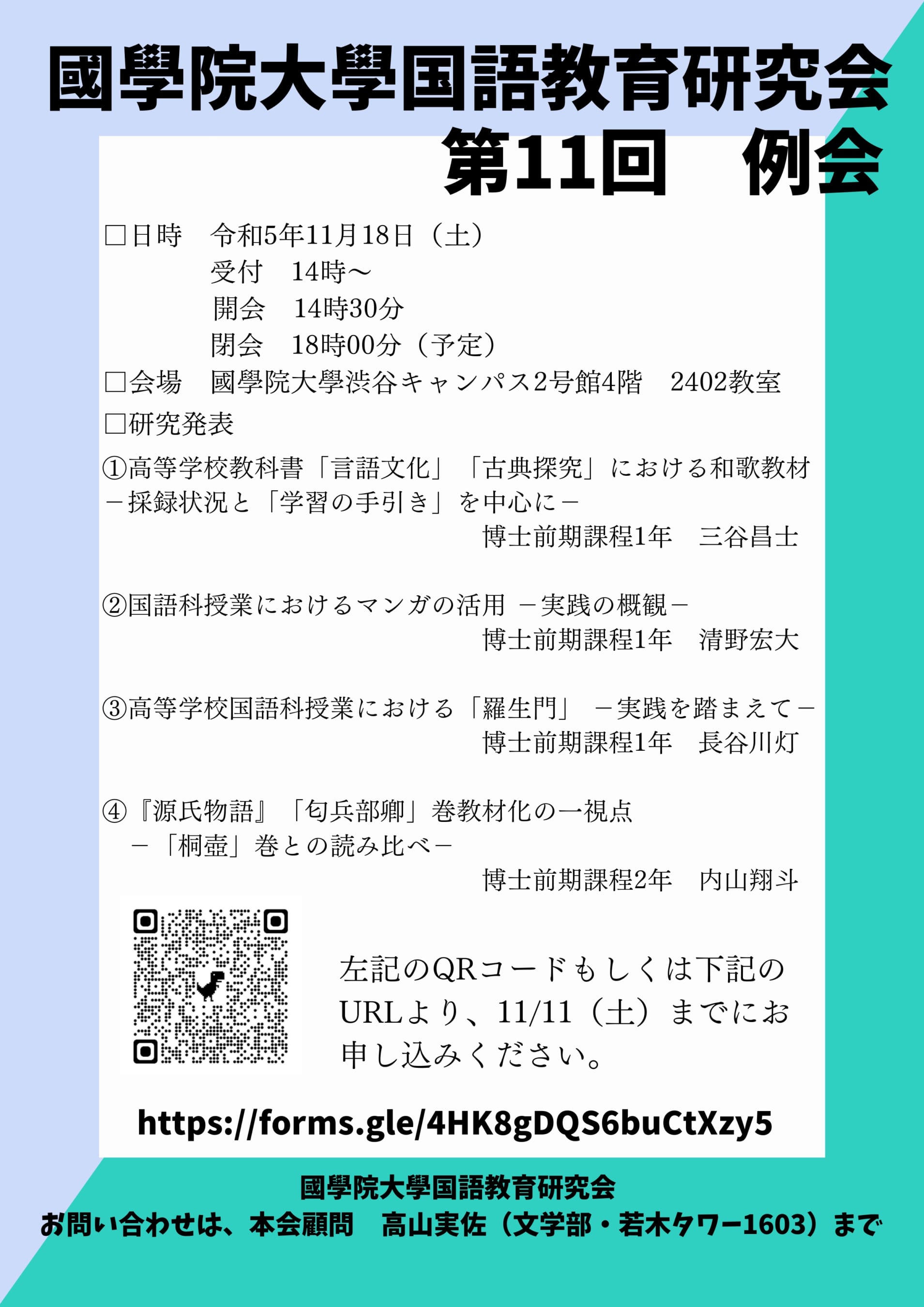 國學院大學国語教育研究会 第11回例会を下記の通り開催いたします。