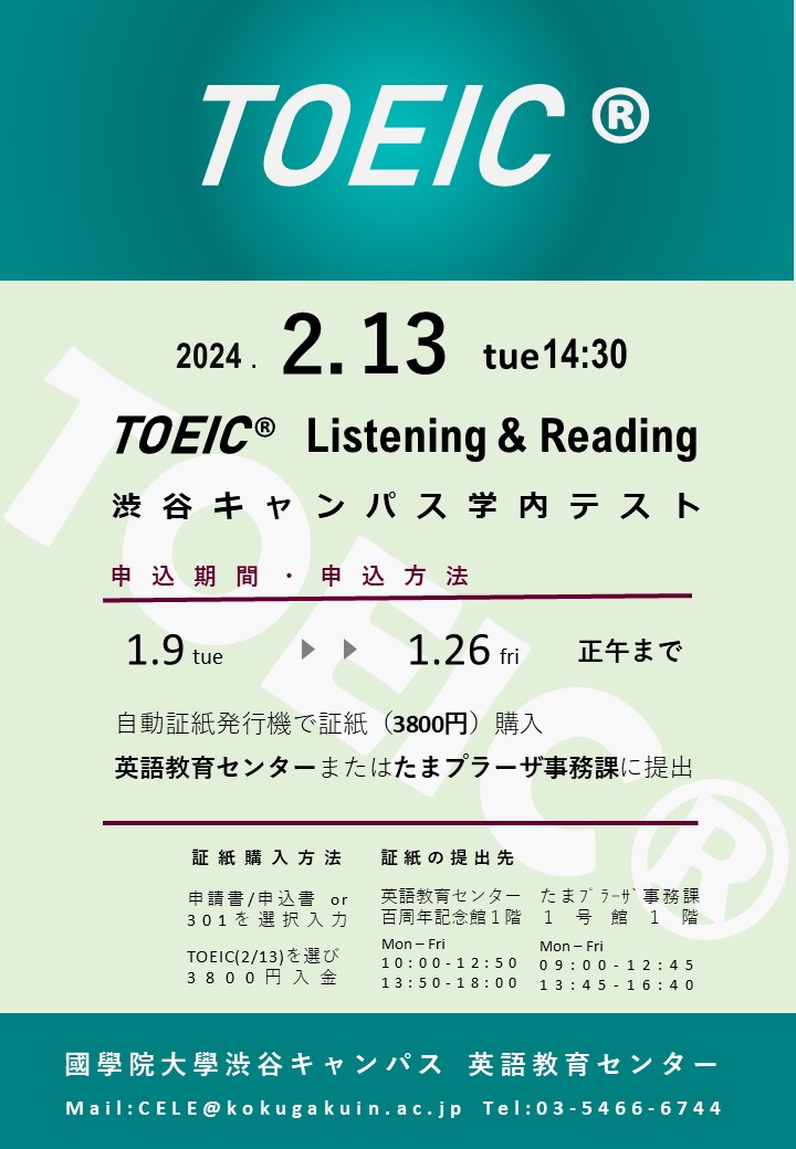 英語教育センターでは、令和6年2月13日(火)に第6回 TOEIC(R) L&R学内テスト(TOEIC IP)を実施いたします。