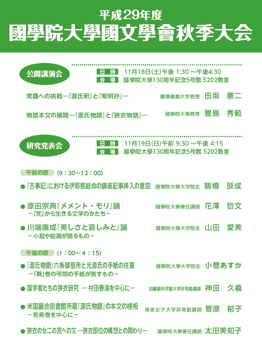下記の通り、平成29年度國學院大學國文學會秋季大会を開催いたします。