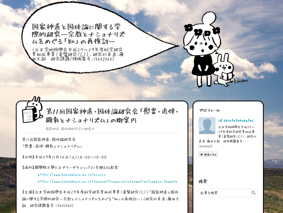 | 問い合わせ | 日本学術振興会平成29年度科学研究費助成事業(基盤研究(C))「国家神道と国体論に関する学際的研究―宗教とナショナリズムをめぐる「知」の再検討―」(研究代表者:藤田大誠 研究課題番号:15K02060) |