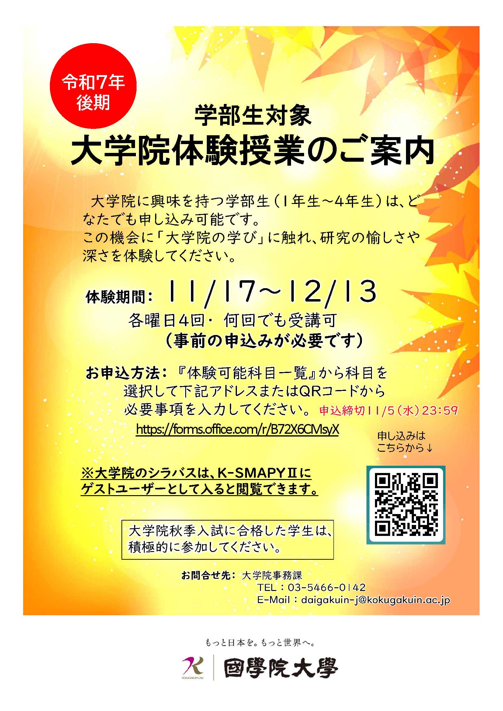 <國學院大學学部生対象:大学院体験授業のお知らせ >