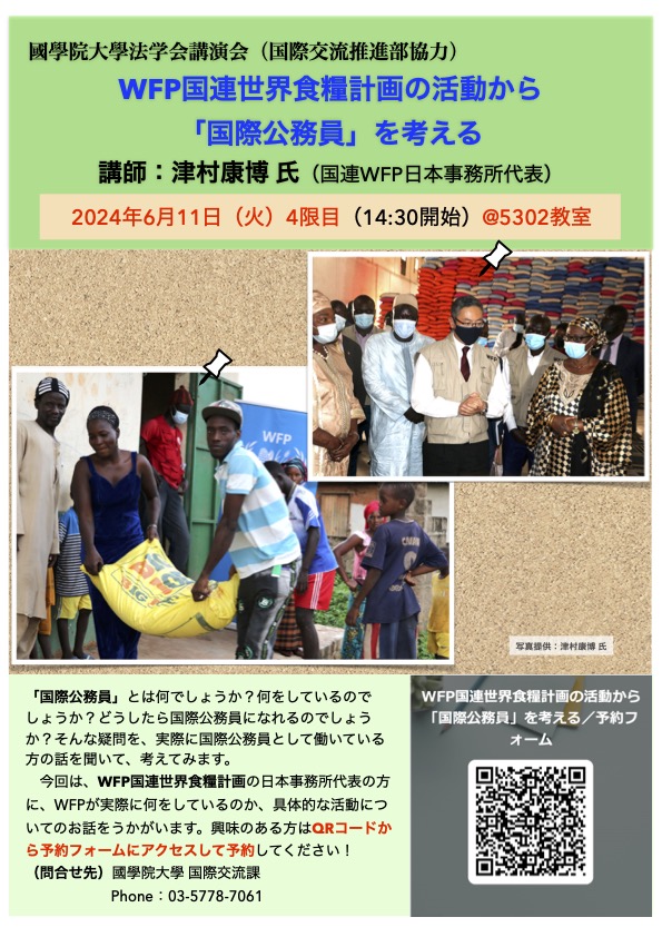そこで、今回、「国際組織法総論」という授業とコラボし、また、国際交流推進部にも協力してもらって、実際に国際公務員として働いている方に国際組織の現場での活動を具体的に語ってもらうことにしました。来ていただく方は、WFP国連世界食糧計画という国連の機関にお勤めの方であり、日本事務所の代表の方です。現場での話を聞き、国際社会での仕事の具体的なイメージを得てください。