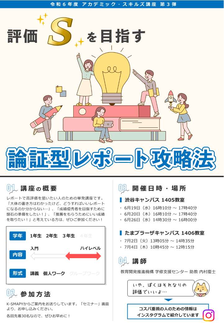 学修支援センターは、このたびアカデミックスキルズ講座 第3弾として、レポートで高評価を狙いたい人向けの単発講座「論証型レポート攻略法」を開催します。