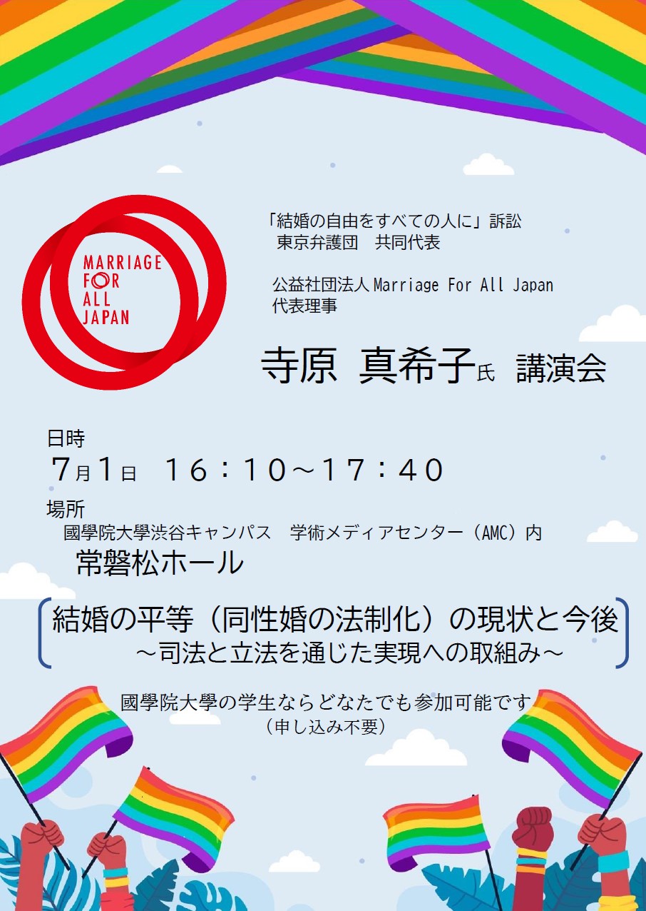 東京地裁においてすでに二つの違憲判決を勝ち取った寺原先生から、判決文を読むだけでは分からない訴訟の背景や、司法・立法を通じた同性婚実現への取り組み、また寺原先生や当事者の想いを直接お伺いできるとても貴重な機会です。本学学生の皆様はもちろん、教員の方々もぜひお気軽に御出席ください。