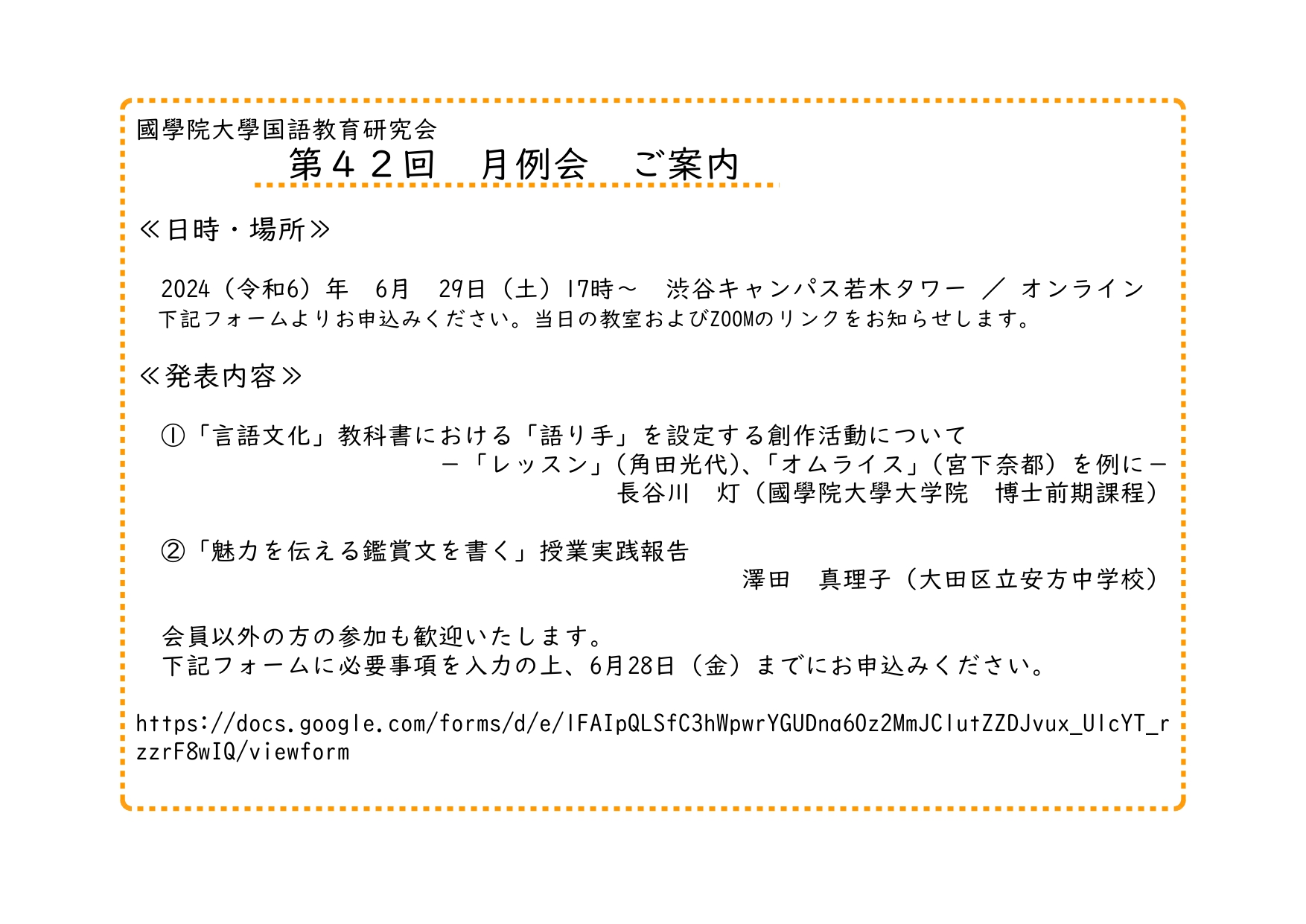 國學院大學国語教育研究会 第42回月例会を下記の通り開催いたします。
