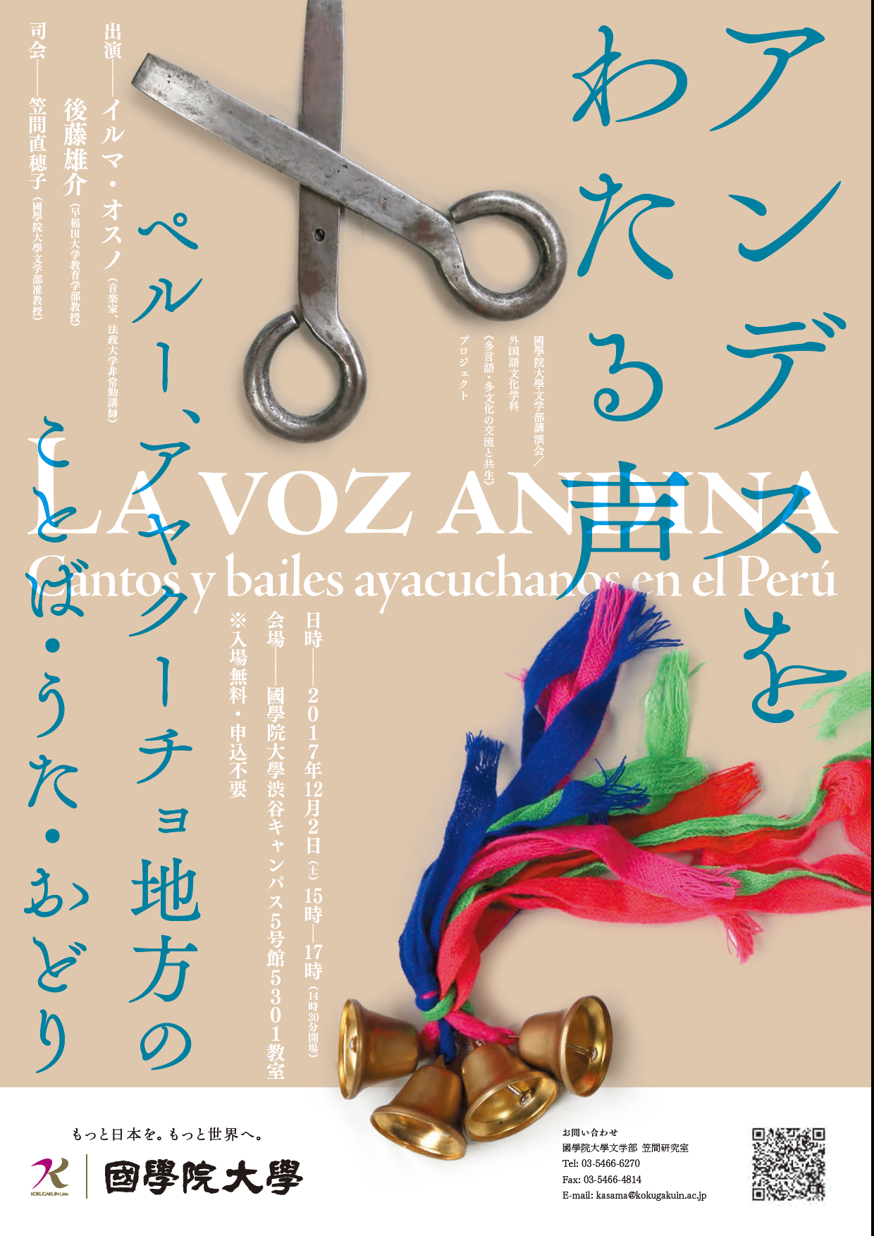「歌やダンスは、私にとって生きることと同じ。だから、どこにいてもやります」とイルマ・オスノは言います。彼女の身体にやどるアヤクーチョの暮らしと芸能とは、どのようなものでしょうか。インカ帝国で使われていたケチュア語とは、どんな言語なのでしょうか。ラテンアメリカ思想文化史を専門とし、ペルー事情に詳しい後藤雄介教授とともに語ります。音楽とダンスの実演もおこないます。