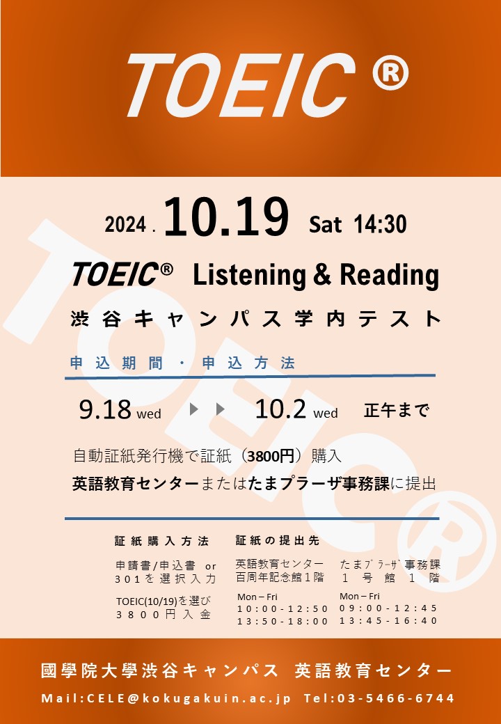 英語教育センターでは、令和6年10月19日(土)に第4回 TOEIC(R) L&R学内テスト(TOEIC IP)を実施いたします。