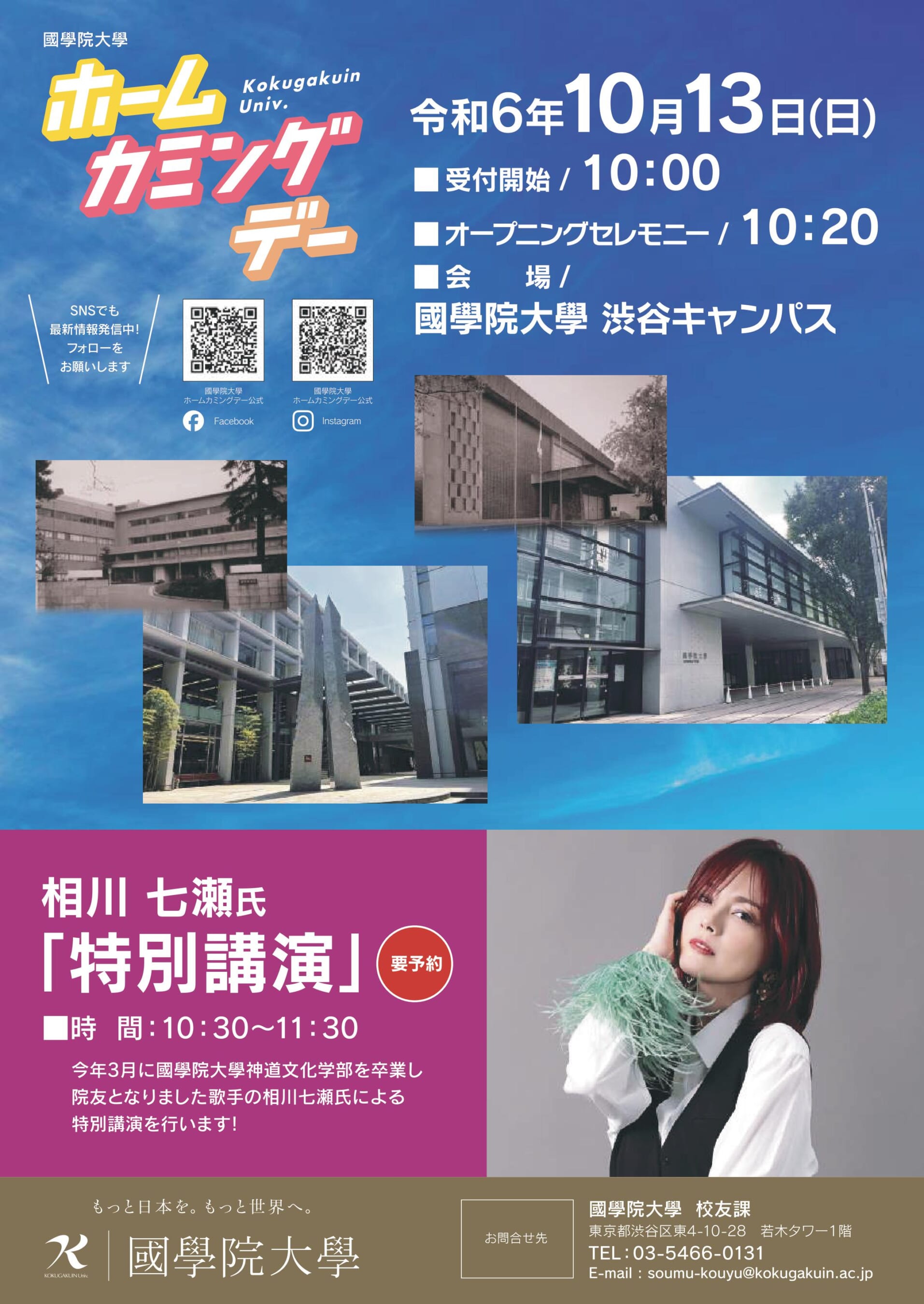 令和6年度國學院大學ホームカミングデーの開催について 在学生卒業生企業・一般教職員クラブ・サークル政治経済教育文化渋谷渋谷キャンパス Tweet 2024年9月13日更新 日時 10月13日(日) 会場 國學院大學渋谷キャンパス 対象 卒業生・在学生・一般 定員 特別講演・特別講義は各450名 問い合わせ 國學院大學校友課 10月13日(日)、渋谷キャンパスにて令和6年度國學院大學ホームカミングデーを開催いたします。 企画内容・申込方法等の詳細はこちらから