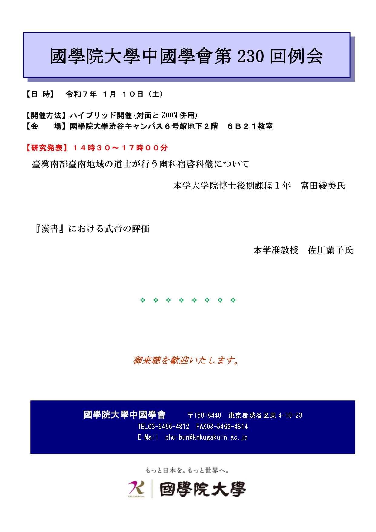 | 開催方法 会場 | ハイブリッド開催(対面とZOOM併用) 國學院大學渋谷キャンパス6号館地下2階 6B21教室 |