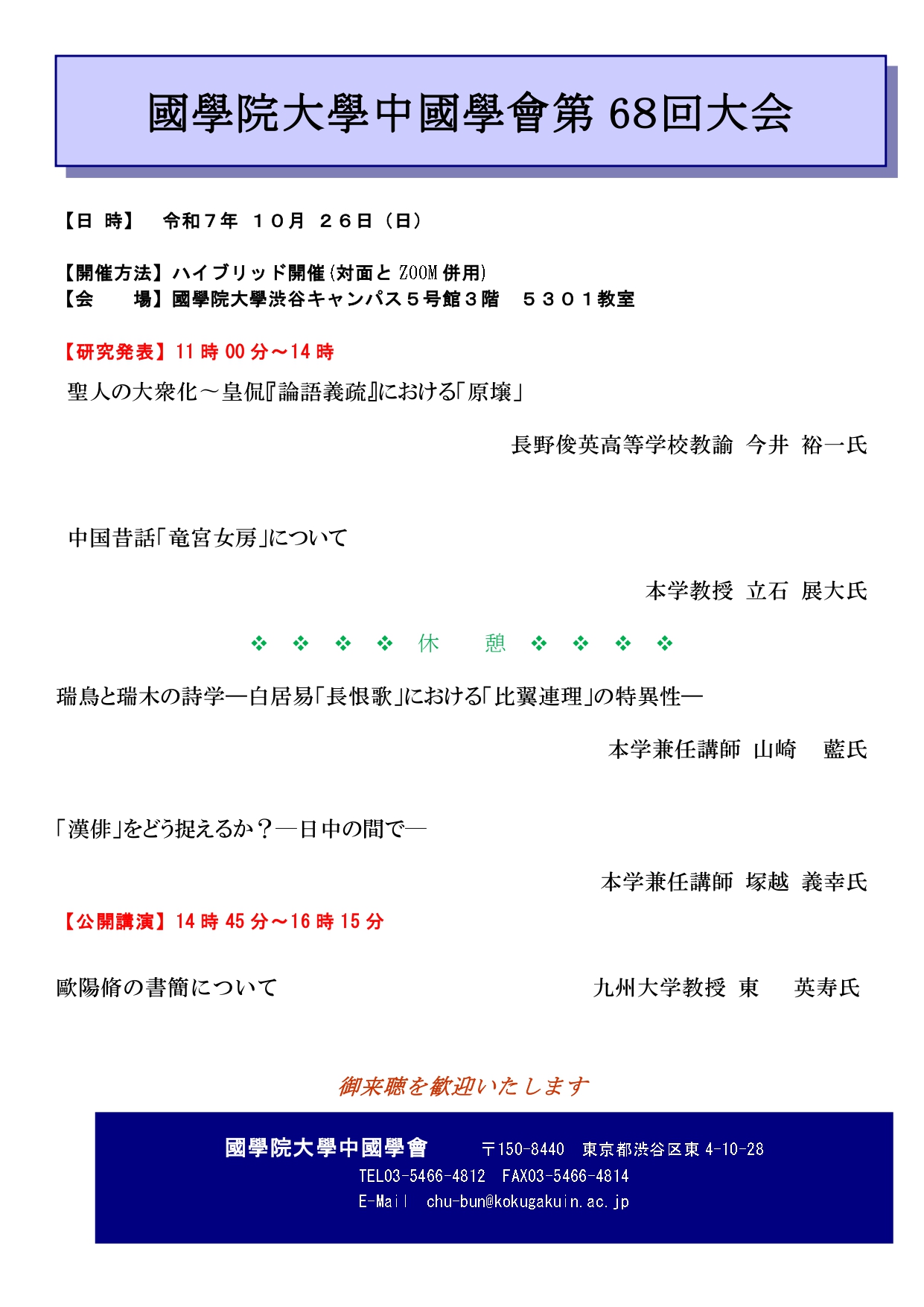 下記の通り、令和7年度 國學院大學中國學會第 68回大会を開催いたします。