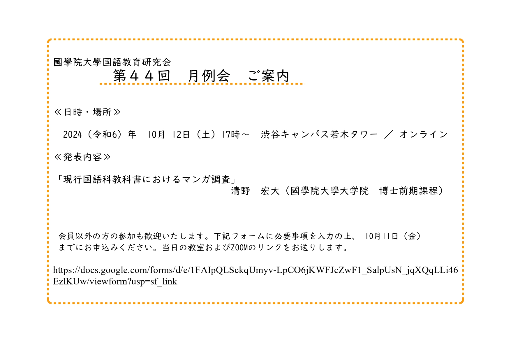 國學院大學国語教育研究会 第44回月例会を下記の通り開催いたします。