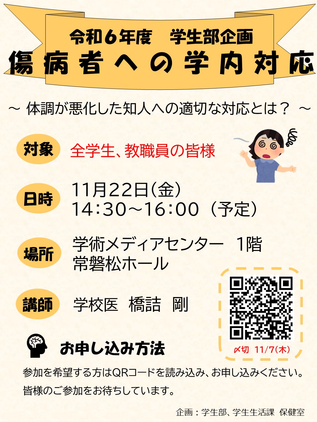 「傷病者への学内対応」をテーマに、学校医による講演を行います。