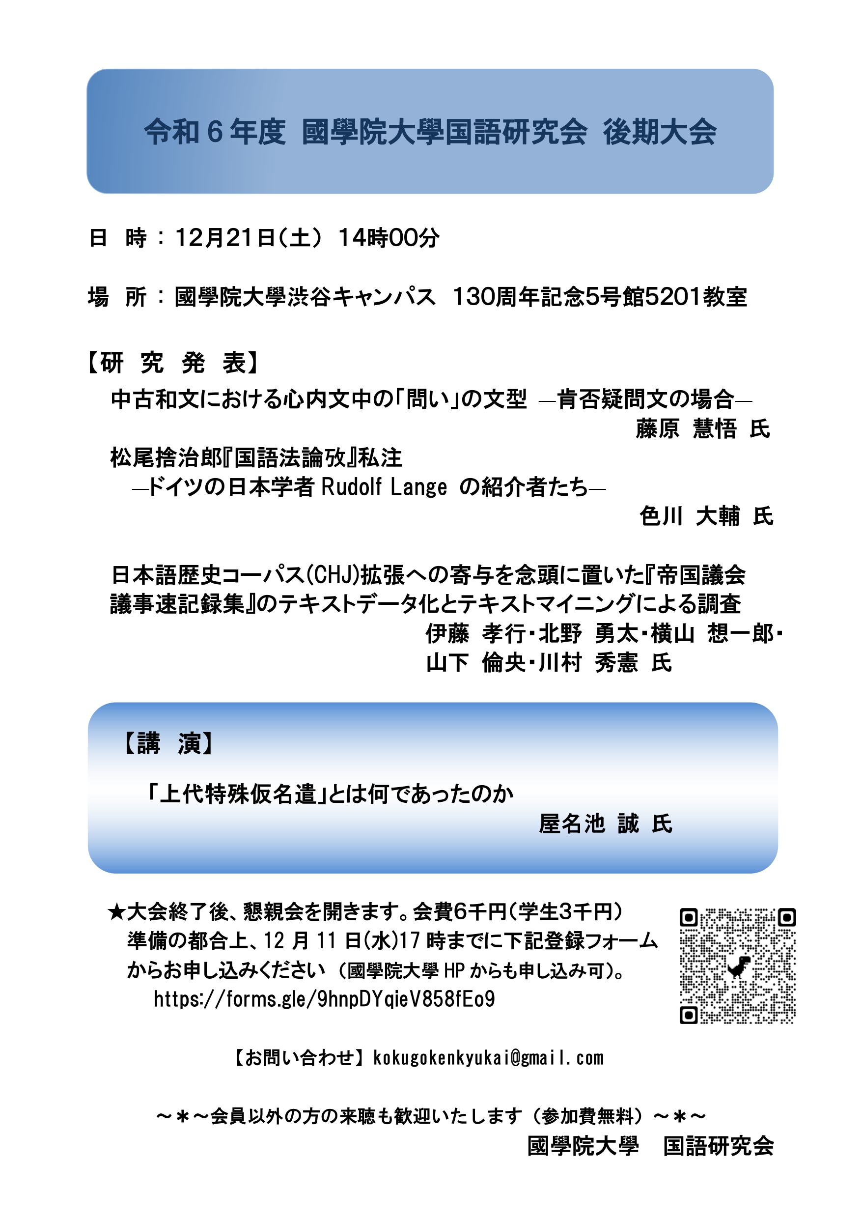 下記の通り、令和6年度國學院大學国語研究会後期大会を開催いたします。
