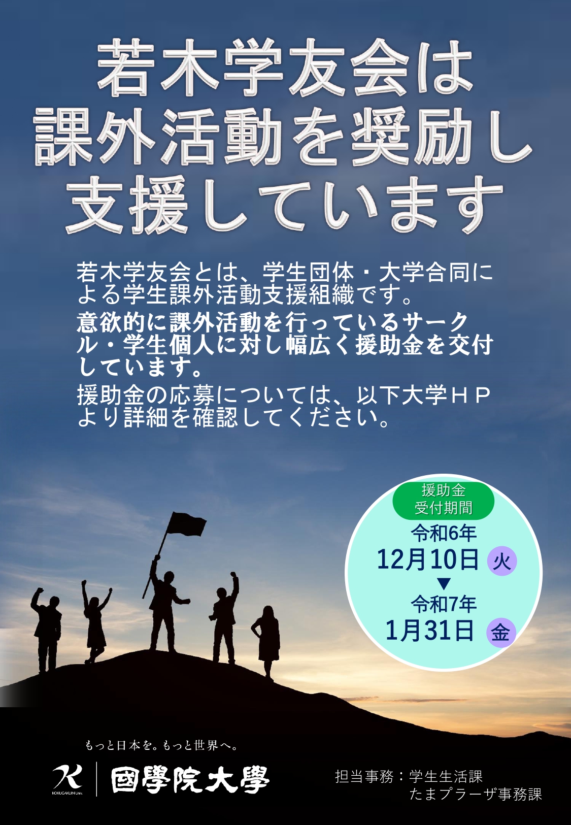 学生団体・大学合同の学生支援組織である「若木学友会」では、学生団体非加盟の公認・準公認部会、および非公認サークルまたは個人単位で課外活動を行っている本学学生を対象に、今年度の活動実績に基づき援助金を交付します。